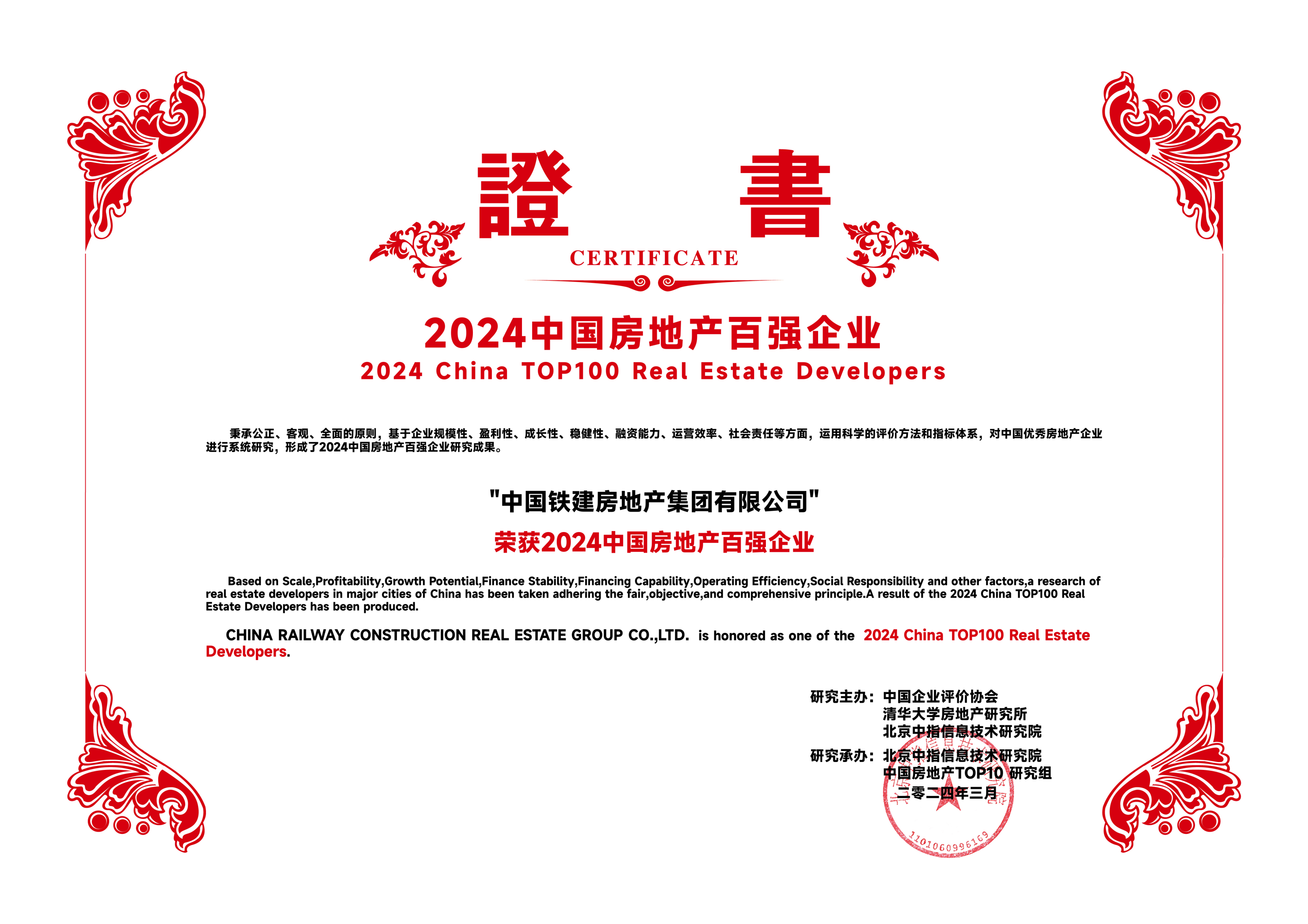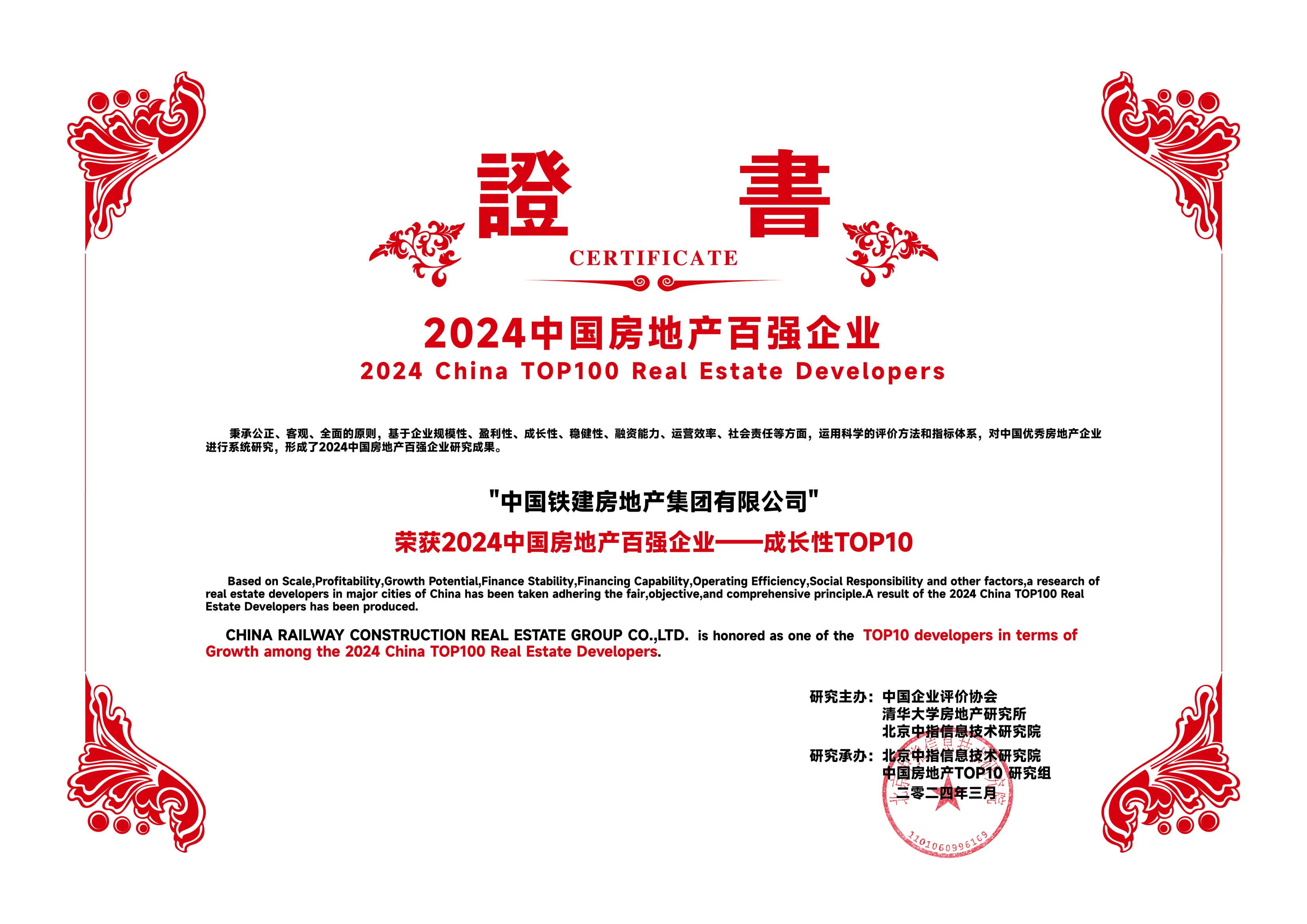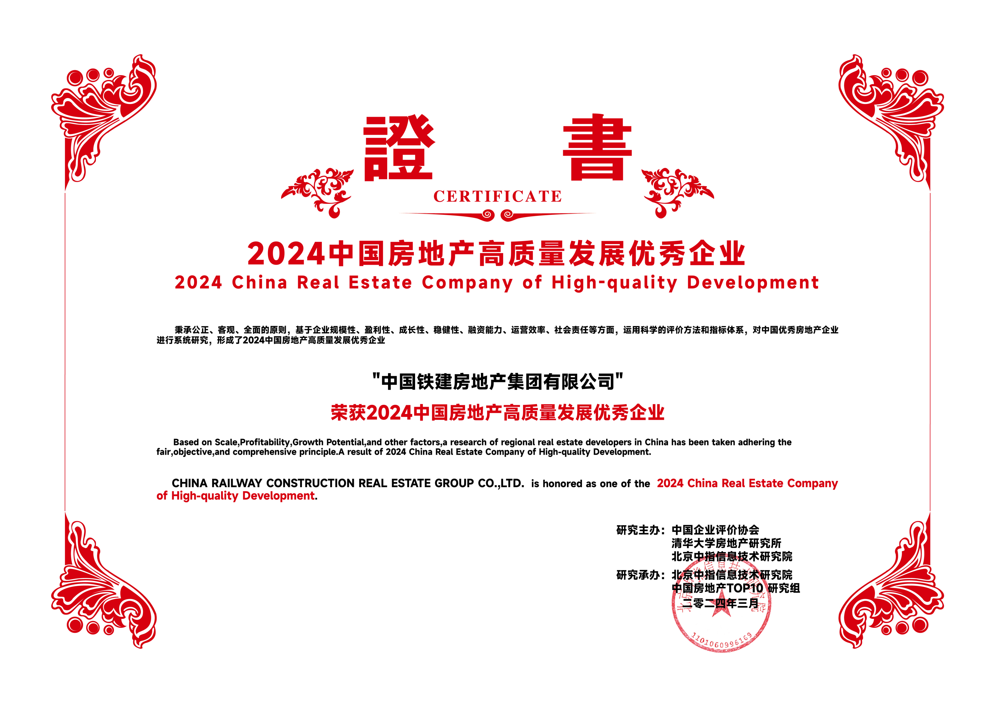 面对复杂多变的市场环境,中国铁建地产聚焦产品力战略目标,推动集团精细化管理,实现业绩目标稳健增长,综合实力不断提升综合实力持续提升,荣获“2024中国房地产百强企业”、“2024中国房地产高质量发展优秀企业”、“2024中国房地产百强企业--成长性TOP10”荣誉。