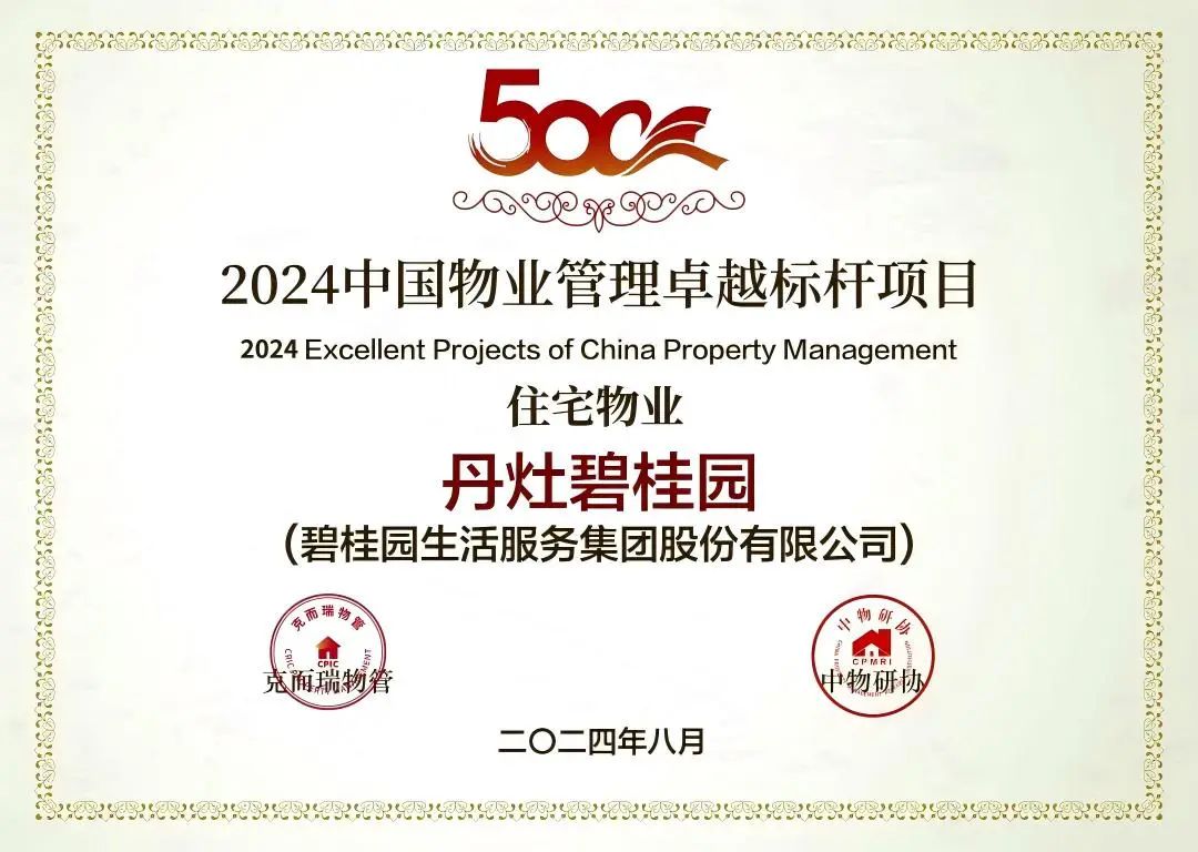 在「2024中国物业服务企业综合实力研究成果」中,碧桂园生活服务集团股份有限公司荣获“2024中国物业服务企业综合实力500强第1名”、“2024中国住宅物业服务领先企业”、“2024中国物业增值服务运营领先企业”、“2024中国物业社会责任贡献领先企业”、“2024中国物业管理卓越标杆项目——丹灶碧桂园(住宅)”奖项。