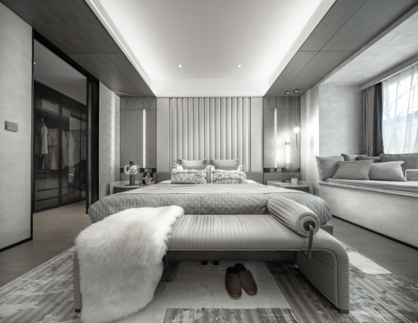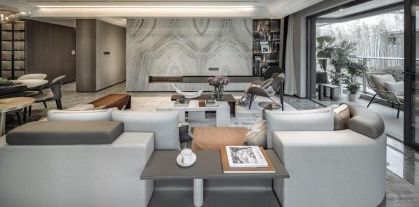 以【麒麟阁】259㎡为例,为了充分利用采光和社区景观资源,设计270°转角阳台,无界视野,充分解读“窗外的价值”;约63㎡会客厅,无缝连接一个西式岛台。宽阔奢适的尺度感着实让人羡慕。