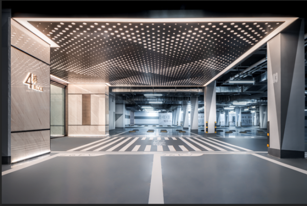 而地下车库实景来看,处理追求整洁素雅,调性统一。系统化模块喷涂的车行指向标识、柱面分区标识、综合类标识,视觉清晰、造型立体,好看好用。顶部穿孔铝板搭配灯光天棚形成重点空间突出,与隐藏在墙体踢脚线处的漫反射灯光共同强化了车库的地下光厅效果。