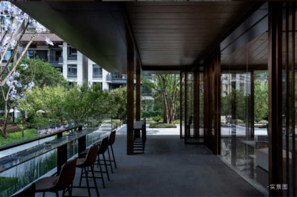 中庭的点睛之笔是中庭会客厅——叠翠阁。再好的景致也离不开一个绝佳的观赏点,叠翠阁是局座在中庭实体大区里停留时间最长的地方。会客厅内装风格偏城市度假,酒店化设计,大量落地玻璃消融室内外边界,这种手法正是近年来流行的景观渗透。未来,这里将成为业主的第二会客厅