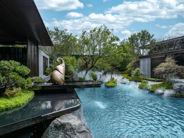 聚澜庭,三层叠水而下,营造礼仪空间水景,整体风格精致典雅;金玉庭,植入休闲躺椅与艺术水景,打造沉浸式度假体验空间;浮翠庭,以雨林为灵感,营造森居会客厅与有氧森吧,让鸟巢创意休憩空间隐匿其中,感受阳光和自然的轻抚。