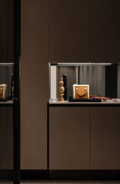 建面约184㎡四室两厅三卫,玄关是室内空间的“门面”,玄关柜以通高柜体设计,既满足了壕宅的入户尊崇感,同时具有极强的收纳力与隐私性。使用定制高级仿奢石大板饰面,优雅精致;玄关柜达到约5000L超大收纳空间,柜内感应灯设置2700K的柔和灯光,贴心人性化。
