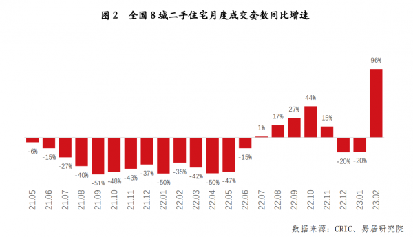 同时,上海易居房地产研究院从成交数据同比增速指标来继续看交易行情。观察历史数据,全国二手23.02住宅的降温周期始于2021年5月份,此时全国重点8城成交数据同比降速为6%,随后降速持续扩大。到了2022年7月份以后,二手房交易行情有过一波拉升,和当时停工断贷潮风波有关。2022年下半年,购房市场确实存在“回避一手期房、选择二手房”的倾向,类似心态自然使得二手房的交易数据略有拉升。不过到了2022年12月份,二手房交易行情继续疲软,降幅为20%。到了今年1月份,虽然降幅为20%,但若对比同样为春节的2022年 2月份,其同比增速为10%,市场已经有了回暖的微弱迹象。而到了2月份,全国8城二手房交易数据明显拉升,同比增速达到96%。