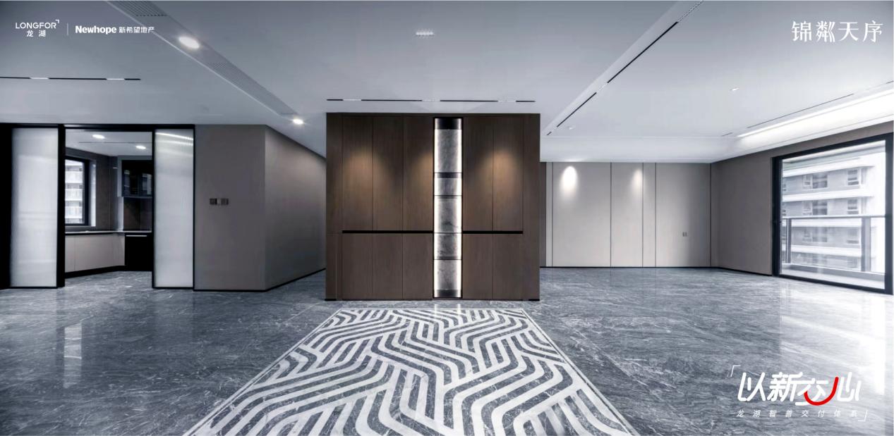 同时,锦粼天序全系户型均采用高标准精装交付。公区装饰强调厚重,首层大堂地面、墙面铺贴大量石材,标准层私家电梯厅则装饰深色墙板。进入室内整座豪宅所沿用的家具,德国-杜拉维特、瑞士-弗兰卡、美国-百朗等全球一线品牌,充满独特个性,又不失奢侈美感。